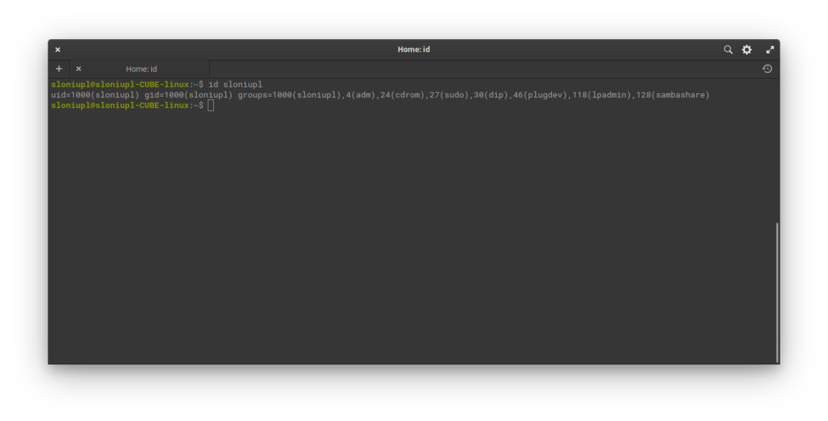 W moim przypadku obie wartości to 1000: uid=1000(sloniupl) gid=1000(sloniupl)