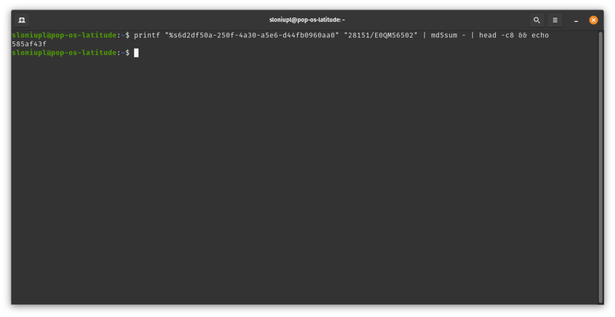 printf "%s6d2df50a-250f-4a30-a5e6-d44fb0960aa0" "28151/E0QM56502" | md5sum - | head -c8 && echo