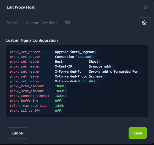 Jeśli używasz Nginx Proxy Manager to polecam w ustawieniach zaawansowanych przekierowania dodać poniższe parametry: